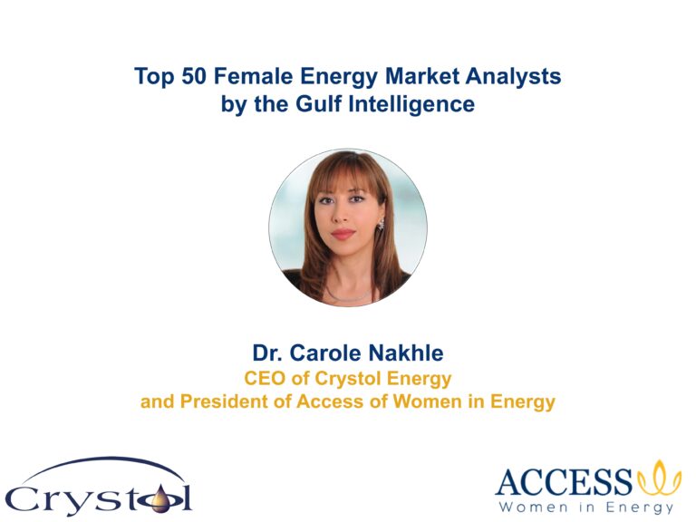 Underlining Crystol Energy’s global recognition, Dr Carole Nakhle features among the ‘Top 50 Female Energy Market Analysts’ by the UAE-based platform Gulf Intelligence, which highlights the most influential voices shaping energy dialogue in one of the world’s most strategic energy regions.