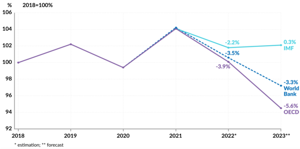 Russia’s GDP shrank to an estimated $1.5 trillion, or 2.1 percent, in 2022. The 2023 forecast ranges from no growth (+0.3 percent), according to International Monetary Fund projections, to a 5.6 percent decline, based on the estimate from the Organisation for Economic Co-operation and Development. But some critics say that the Russian government’s concealment of official data is masking deeper problems.